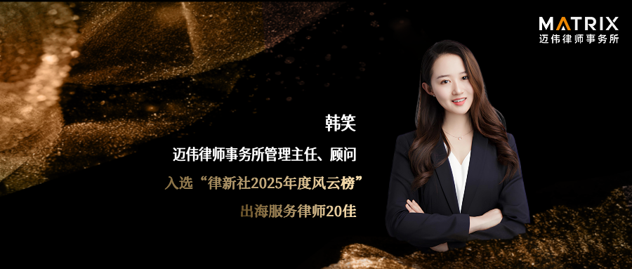 2025年12月16日,律新社发布“律新社2025年度风云榜——出海服务律师20佳”榜单。凭借在企业出海领域丰富的执业经验、出色的业绩表现与卓越的市场口碑,迈伟律师事务所管理主任韩笑顾问荣誉登榜。